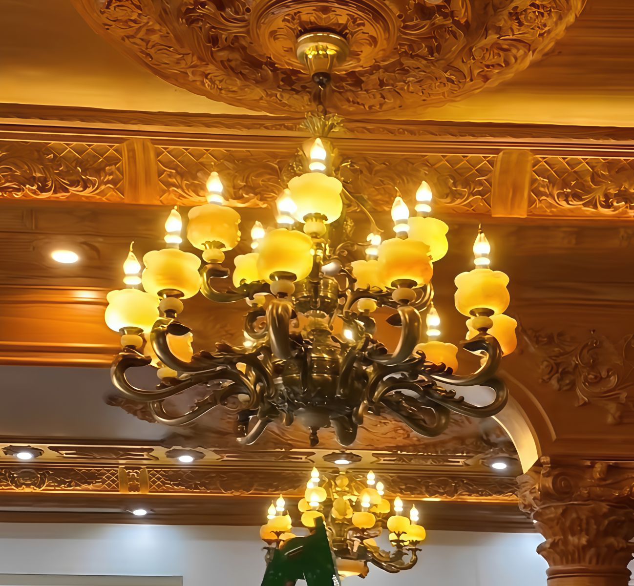 • Đèn chùm đồng bát đá thiết kế vô cùng sang trọng đẳng cấp, vừa làm đẹp cho không gian sống, vừa khẳng định được phong cách, địa vị của chính gia chủ. Thân đèn được sản xuất từ chất liệu đồng nguyên chất, với công nghệ sản xuất hiện đại cùng đôi bàn tay khéo léo của các nghệ nhân, đèn chùm đồng trang trí cuốn hút người xem chính bởi những đường nét chi tiết chạm khắc tinh xảo, đẳng cấp trên thân đèn.