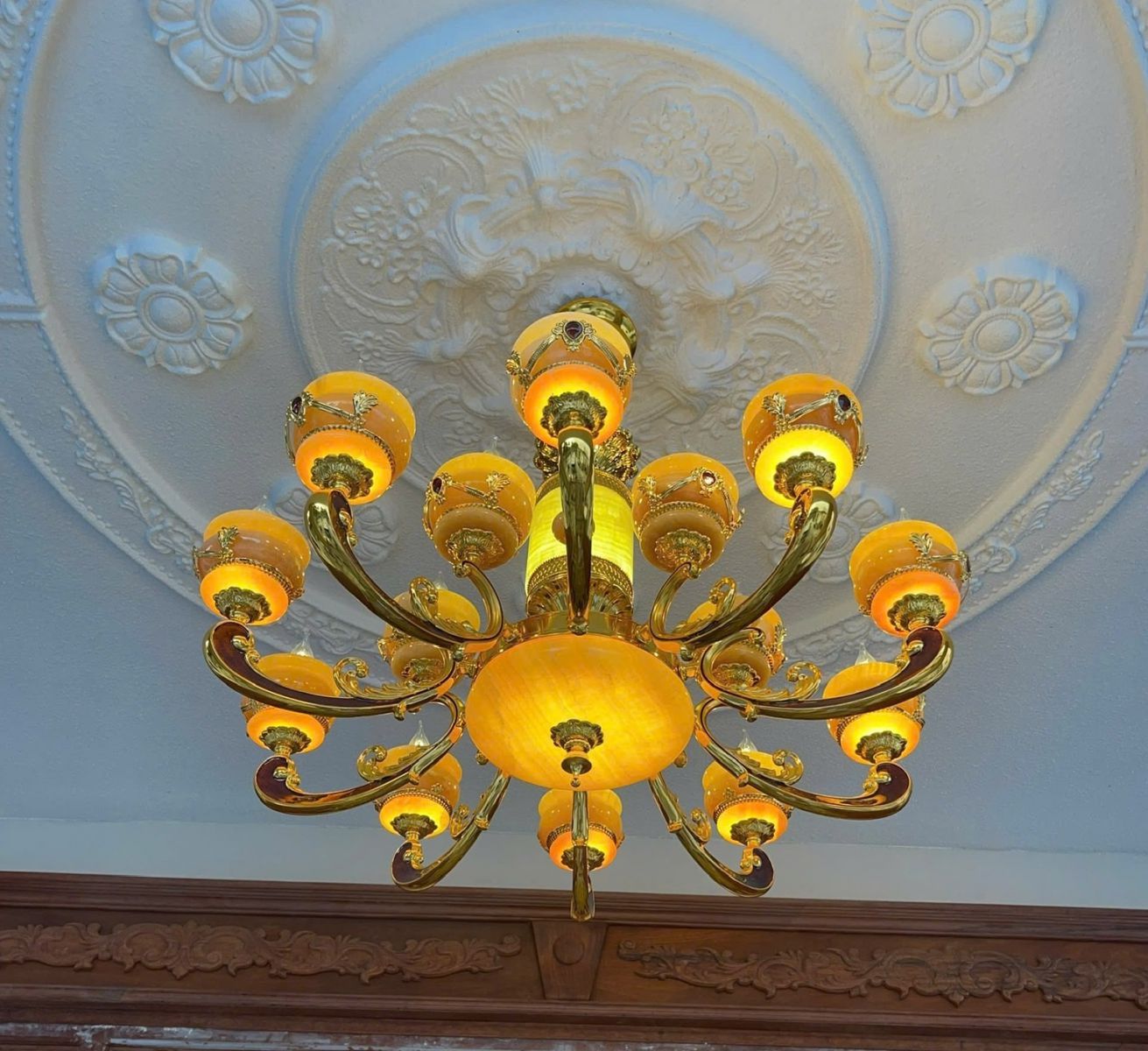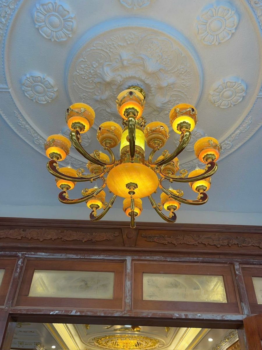 • Đèn chùm đồng bát đá thiết kế vô cùng sang trọng đẳng cấp, vừa làm đẹp cho không gian sống, vừa khẳng định được phong cách, địa vị của chính gia chủ. Thân đèn được sản xuất từ chất liệu đồng nguyên chất, với công nghệ sản xuất hiện đại cùng đôi bàn tay khéo léo của các nghệ nhân, đèn chùm đồng trang trí cuốn hút người xem chính bởi những đường nét chi tiết chạm khắc tinh xảo, đẳng cấp trên thân đèn.