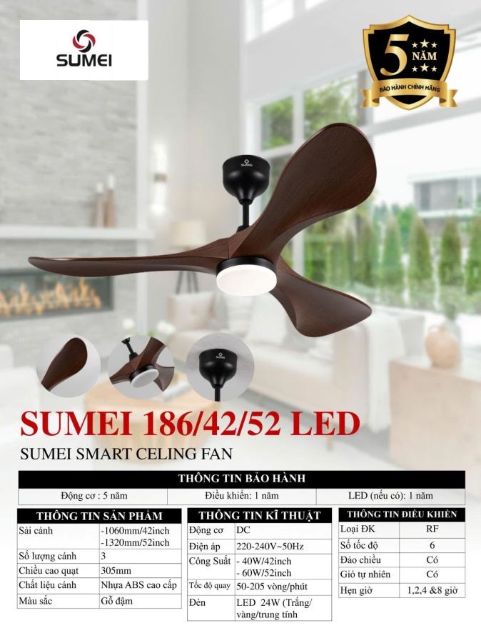 | Đèn cấp cho quạt | LED 24W x 2, ánh sáng 3 màu |