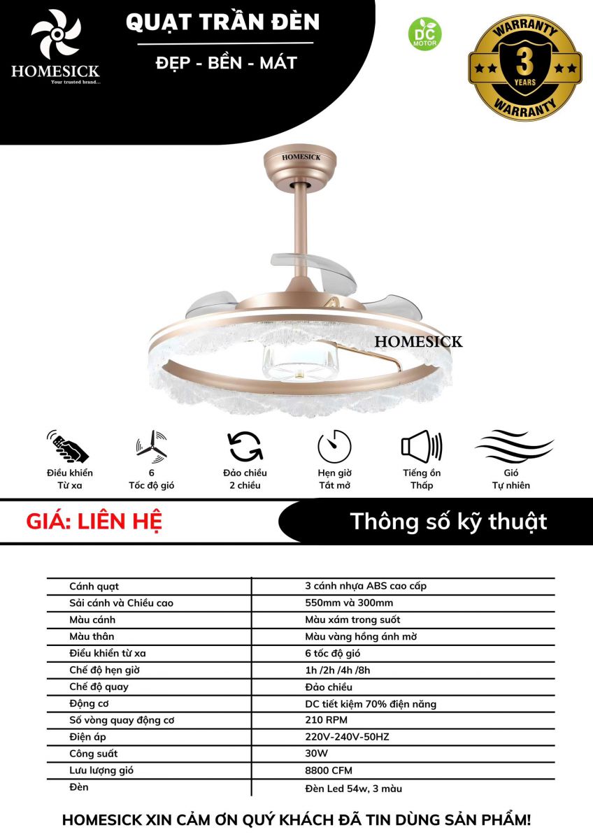 Quạt trần giấu cánh Homesick này có kiểu dáng sang trọng, cổ điển, tôn thêm giá trị căn phòng và ngôi nhà bạn.