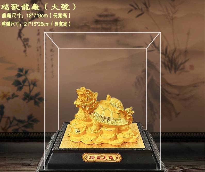 - Tượng phong thủy Long Quy mạ vàng 24K là sự kết hợp hoàn hảo của 2 linh vật trong tứ linh là Rùa và Rồng. Tượng Long Quy được đúc có dáng đứng bệ vệ, uy nghiêm với đầu ngẩng cao. Linh vật cõng trên lưng một chú rùa con, với thần thái uy nghiêm, cái nhìn chăm chú.